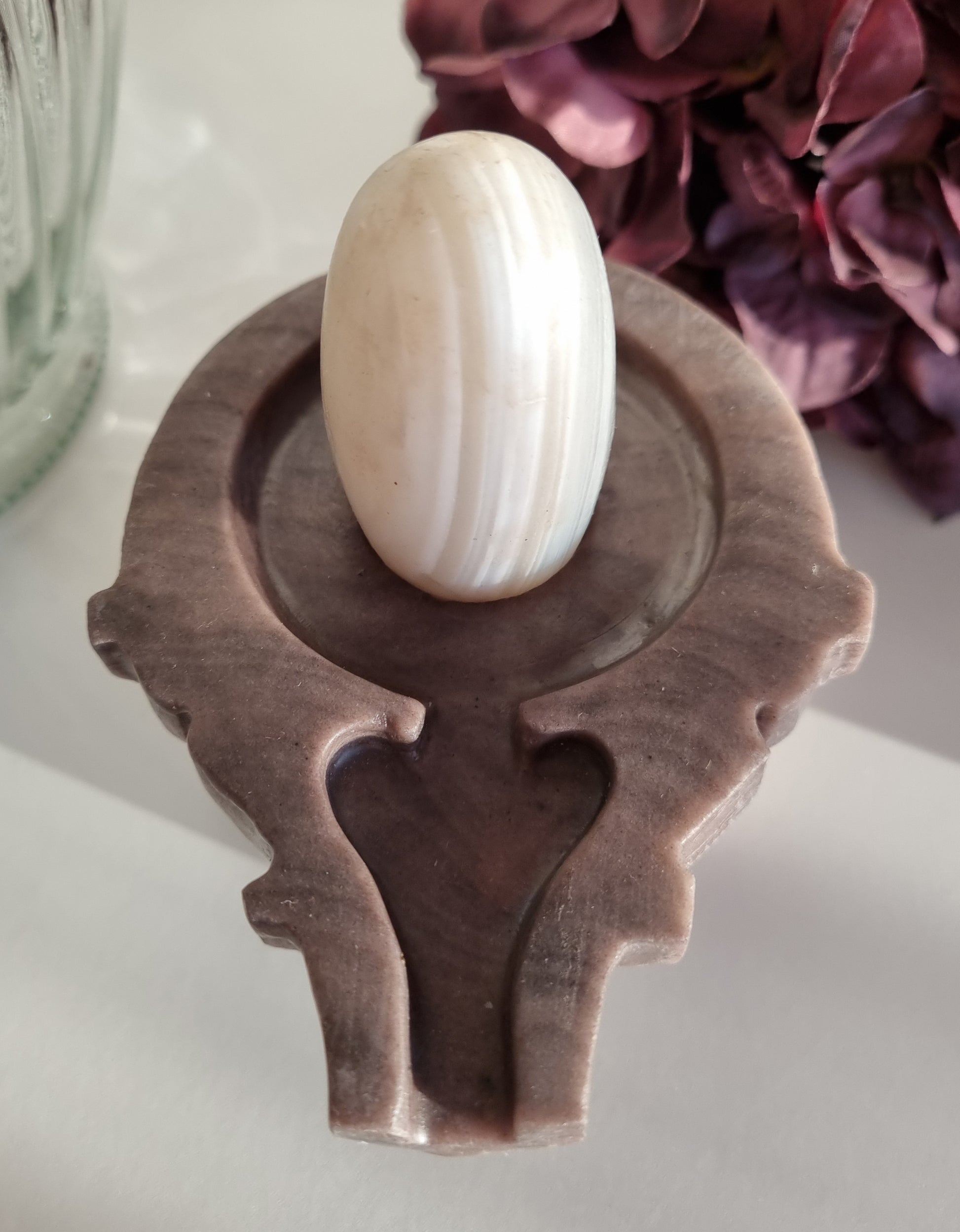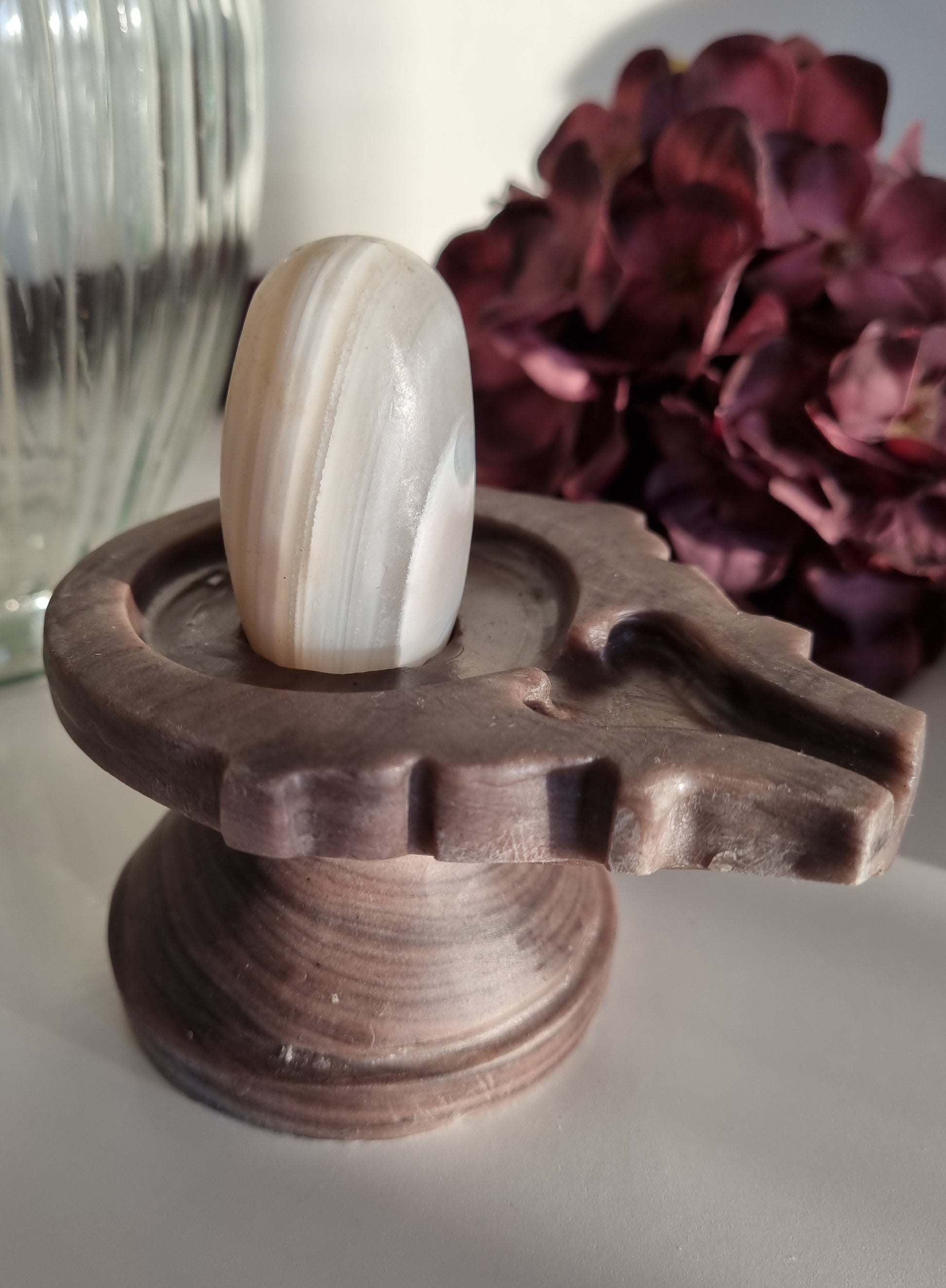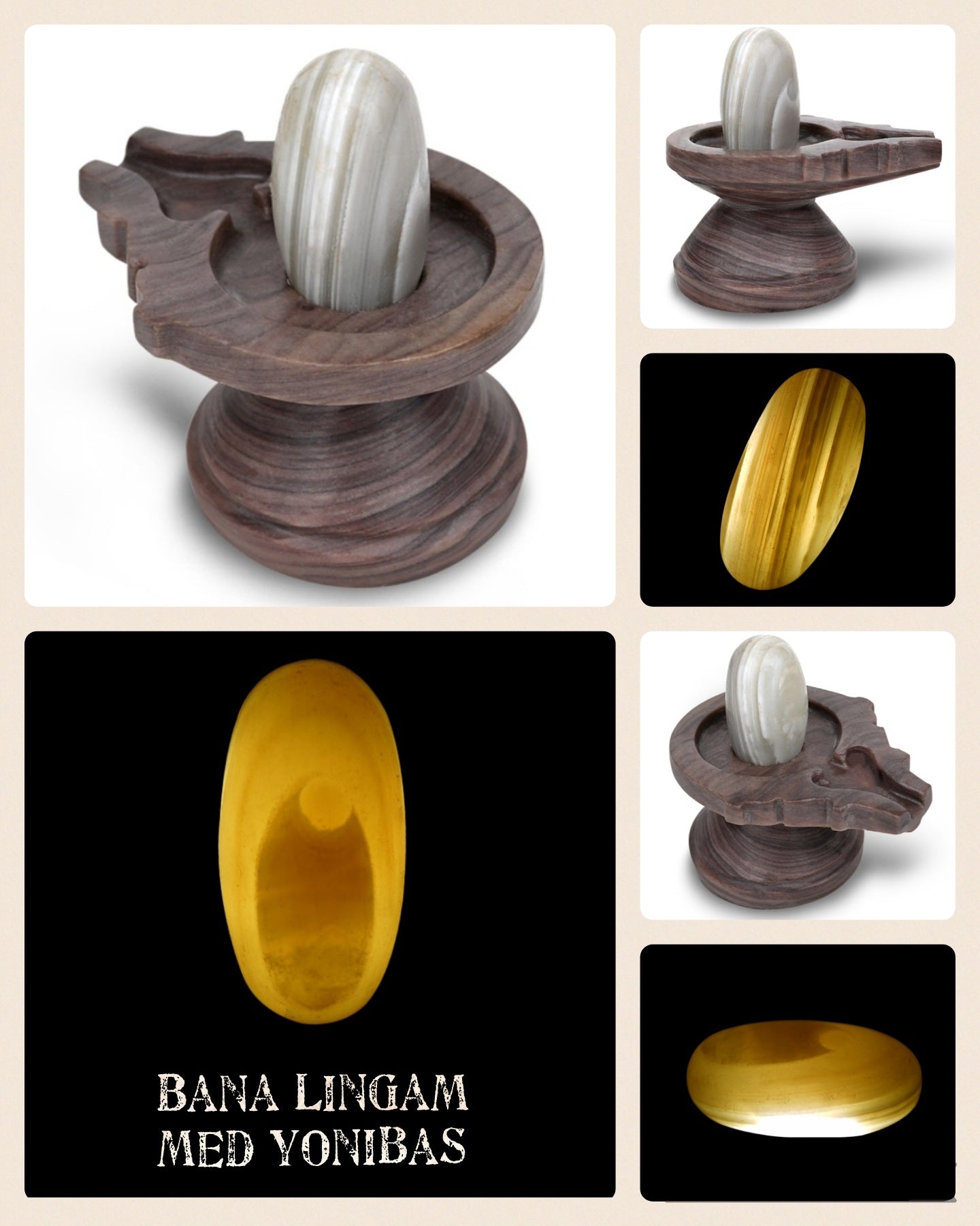 Upplev den andliga kraften hos kristalliserade Banalingam från Narmadafloden! Varje decennium, eller så, när Narmadafloden svämmar över och själva botten vänder sig, presenterar naturen en gåva av Banalingams som rullar upp på stranden. Våra Banalingams är noga utvalda och vilar fridfullt i en handgjord yonibas, skulpterad ur sten från den heliga floden Narmada.